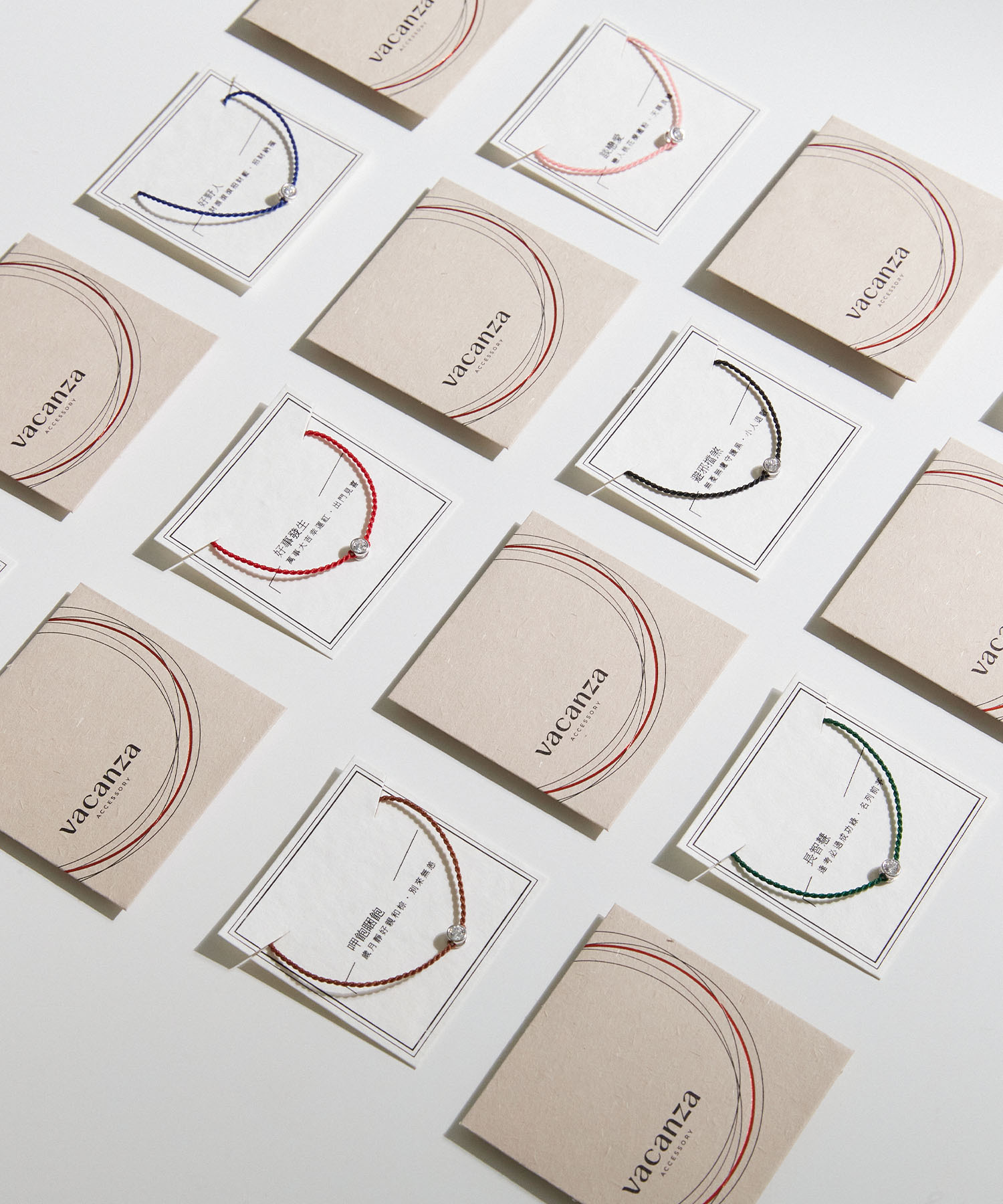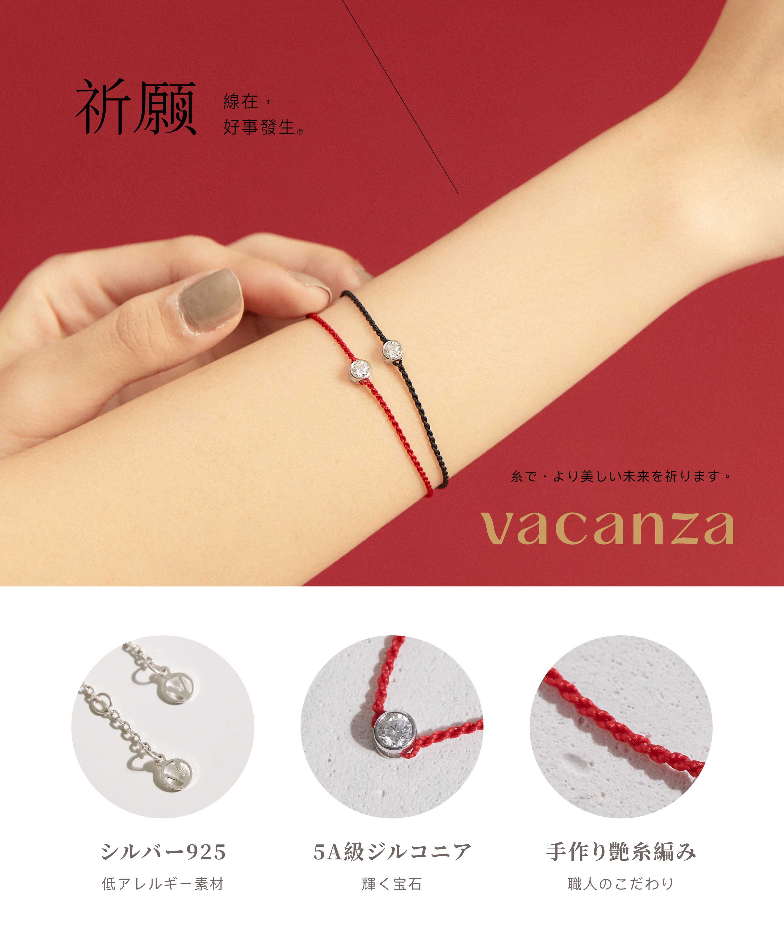 vacanzaの「祈願シリーズ」ブレスレットは、台湾の伝統的な赤い糸文化にインスパイアされ、洗練されたデザインに改良されています。細密で耐久性が高く、さまざまなスタイルに合わせやすい特徴を持っています。このシリーズは色彩学を取り入れ、美しい意味を込めた色を展開し、あなたの人生の重要な瞬間を多彩に彩ります。